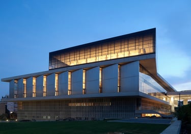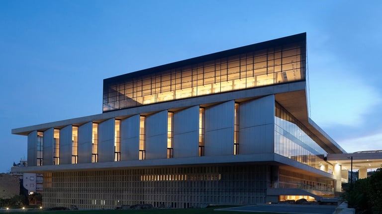A modern museum showcasing artifacts from the Acropolis, with a unique view of the ancient ruins.