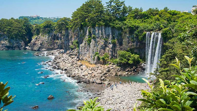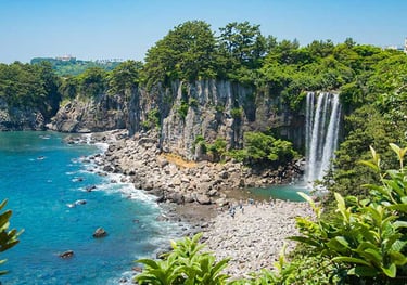 Jeongbang Waterfall cascades directly into the ocean, creating a unique and serene natural spectacle on Jeju Island.
