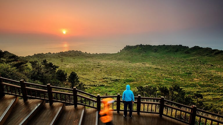 Climb Seongsan Ilchulbong, Jeju's volcanic marvel, for stunning sunrise views over its vast, ancient crater.