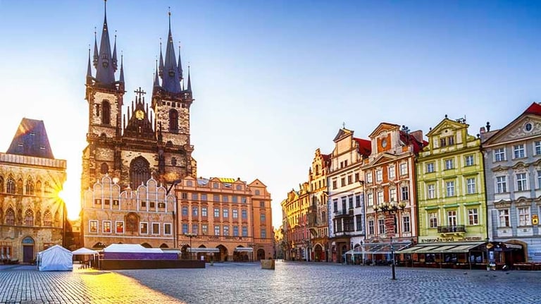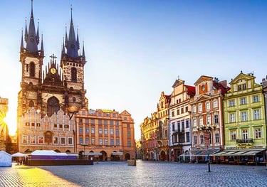 A bustling hub with Gothic and Baroque architecture, home to the famed Astronomical Clock that puts on a charming hourly show and is surrounded by lively cafes and street performers.