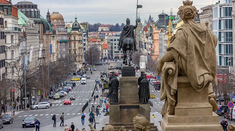 A historic square that has been the setting for many of Prague's most important events, lined with shops, restaurants, and historical monuments, including the National Museum.